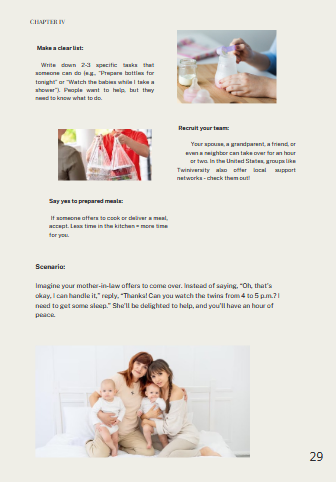 What it is: 5 minutes of relaxation, delegation scenarios, and tips for taking a quick nap. Benefit: You stay energetic and patient, even after sleepless nights. Why it matters: Your well-being is the foundation of a happy twin household.