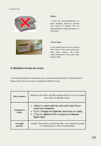 What it is: 5 minutes of relaxation, delegation scenarios, and tips for taking a quick nap. Benefit: You stay energetic and patient, even after sleepless nights. Why it matters: Your well-being is the foundation of a happy twin household.